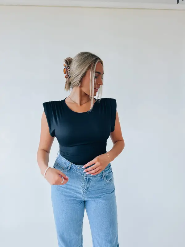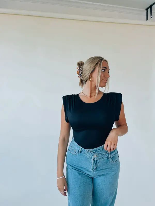 Our Black Trendsetter Bodysuit has a soft ribbed fabric that gives it a fitted silhouette. This bodysuit has puff shoulders, a sleeveless cut, low armhole, and has a snap button closure. Add this bodysuit to your closet to pair it with any items for a basic effortless look!