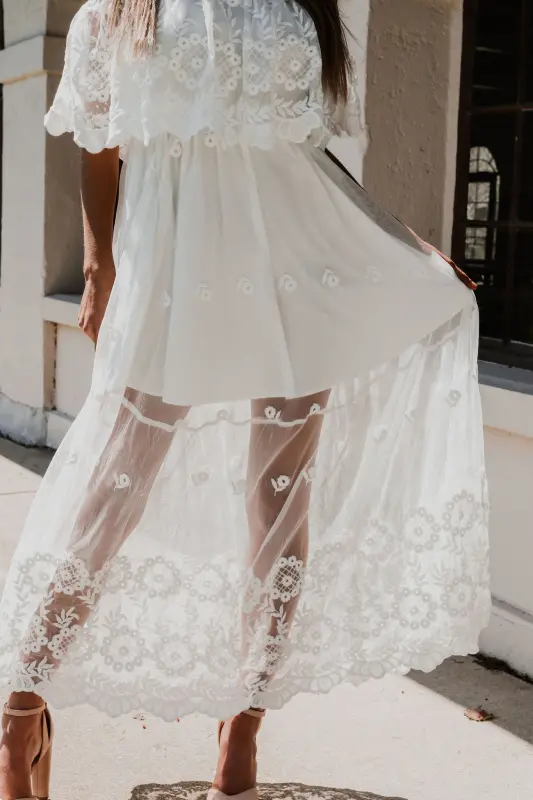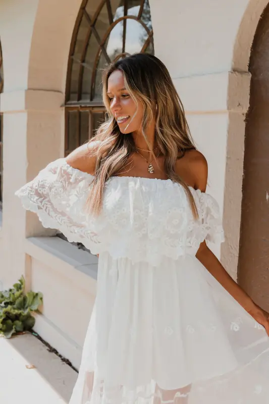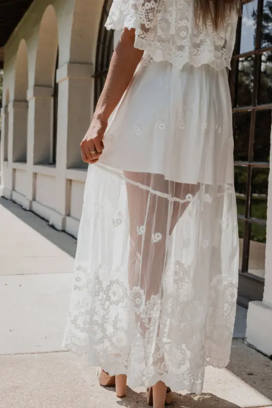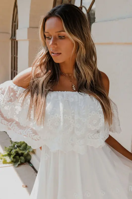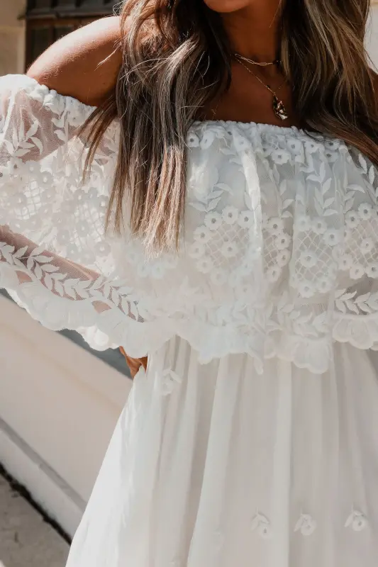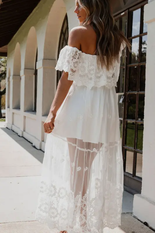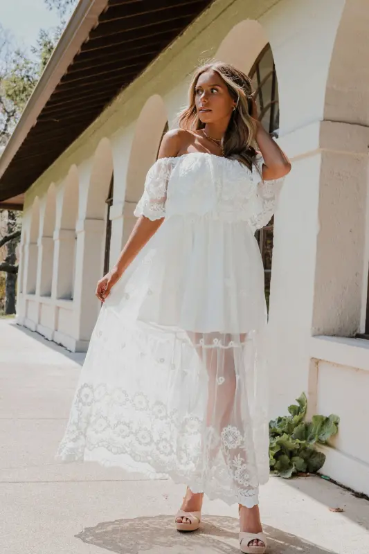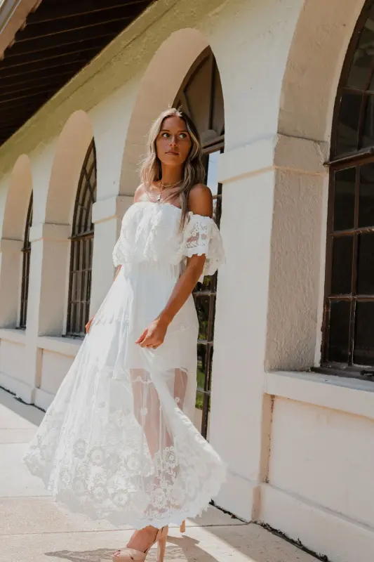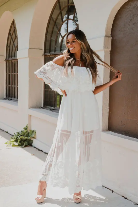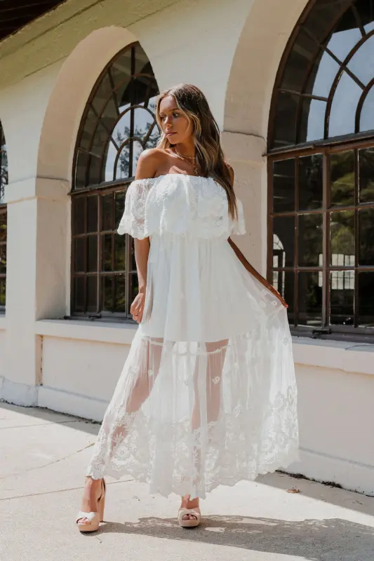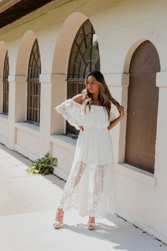 • Our off the shoulder maxi dress is a gorgeous light-weight with beautiful lace detail throughout.
