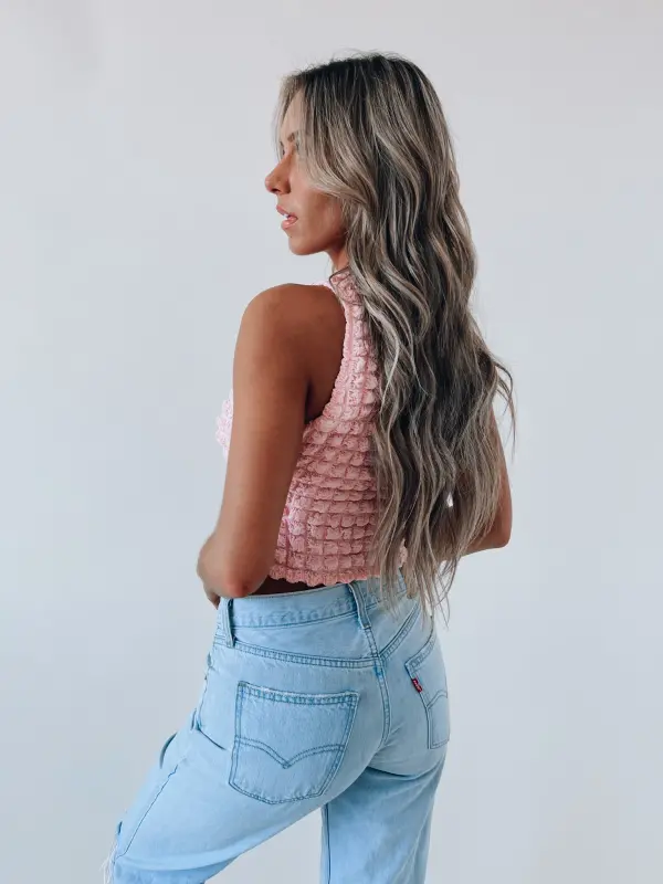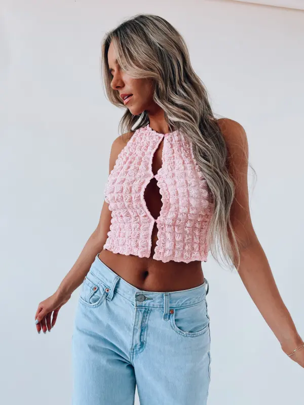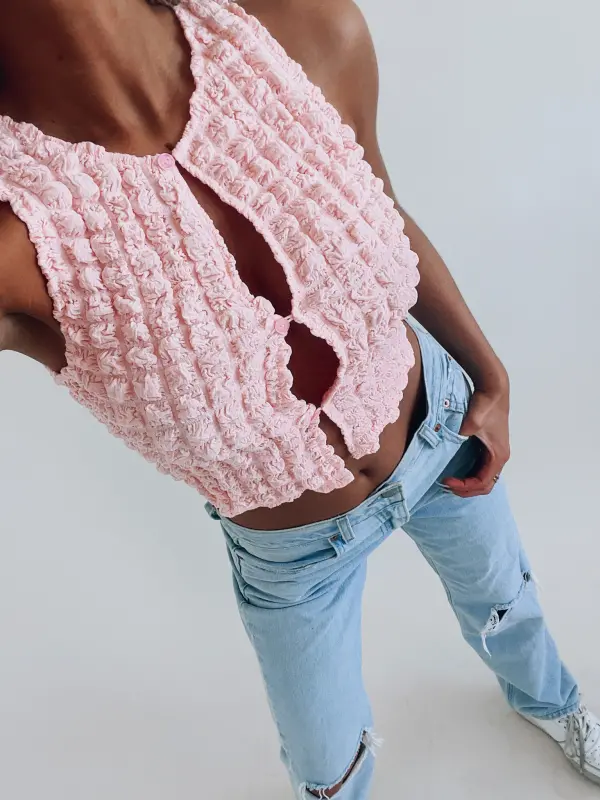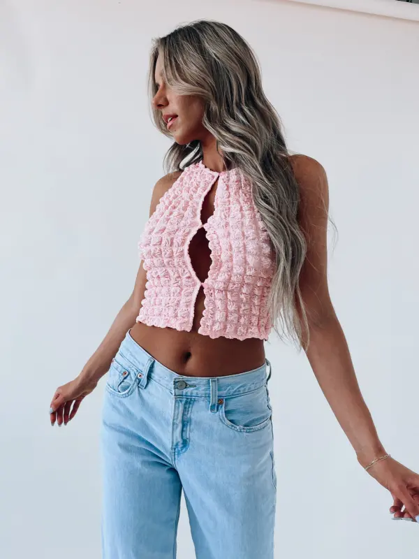 Our Peachy Bubble Tank is a textured sleeveless tank with a 3 button up closure. This top is made of a lightweight textured material that gives it an extra bit of style. This top is customizable in its fit with the ability to button and unbutton it to create a different style.